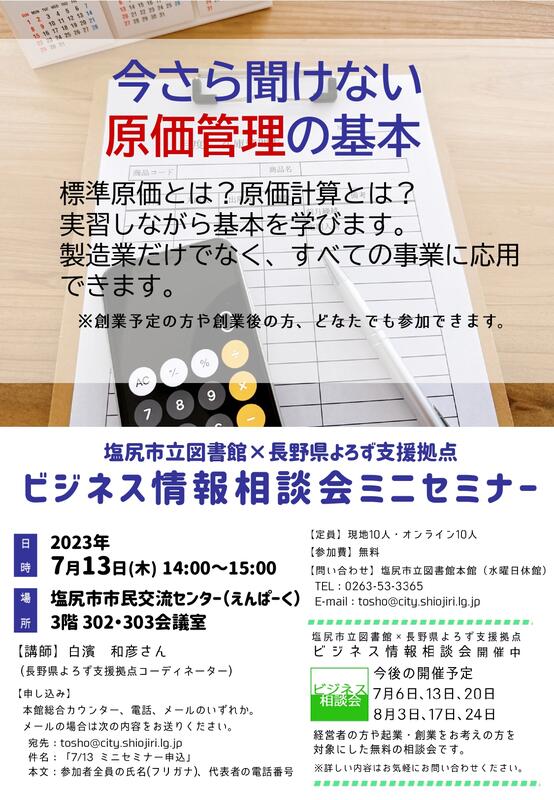 7月13日(木)14:00~15:00 塩尻市立図書館×長野県よろず支援拠点『ビジネス情報相談会ミニセミナー』