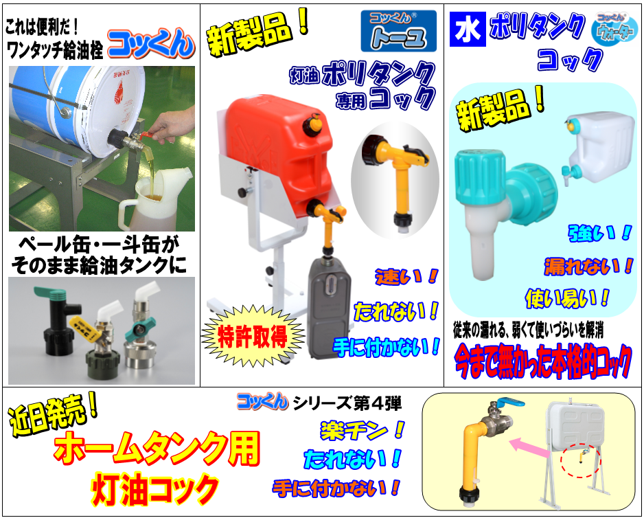 ◆高品質センターレス研削加工 ***最小径φ0.3まで加工可能!**** 同業他社では加工困難とされるφ0.3のセンターレス加工といった 精密加工を実現しています。 もちろん加工精度も±0.0005まで可能です。 ◆新企画商品 ***ワンタッチ給油栓「コッくん」**** ペール缶・一斗缶・ドラム缶に取り付けて、缶を横にすればそのまま給油タンクに! 油こぼれなくスムーズな小分け給油ができ、繰り返し使用でき経済的です。 ***灯油ポリタンク専用コック「コッくんトーユ」*** <3大特長> ~特許取得~ ★速い! なんと3ℓが10秒。手動ポンプの5倍。 ★たれない! 注ぎ口のフエルトで残液をすっきり吸収。 ★手に付かない! 新スライドノズル機構で手に付かない。 ***水ポリタンク用コック「コッくんウォーター」*** 今までなかった本格コック ~防災用・アウトドア・名水汲み等に~ 3大特長 ★強い! 強度考慮安全設計 ★漏れない! 各部ダブルOリング使用 ★使い易い! 大型回転ツマミで操作らくらく ***非常用浄水器 コッくん『飲めるゾウ』シリーズ*** <用途に合わせて選べる3タイプ> ★飲めるゾウビッグ 大規模対応1000人以上 ★飲めるゾウ 中・小規模対応100人程度 ★飲めるゾウミニ 個人以上 |